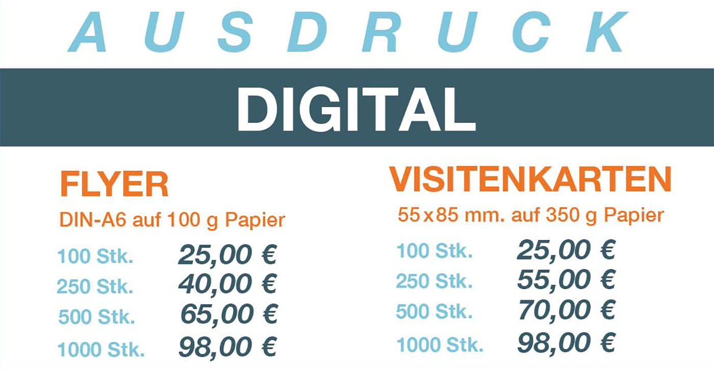Preisliste Digitaldruck * Alle Preise inkl. MwSt., Änderungen und Irrtümer vorbehalten. Weitere Auflagen und Rabatte auf Anfrage.